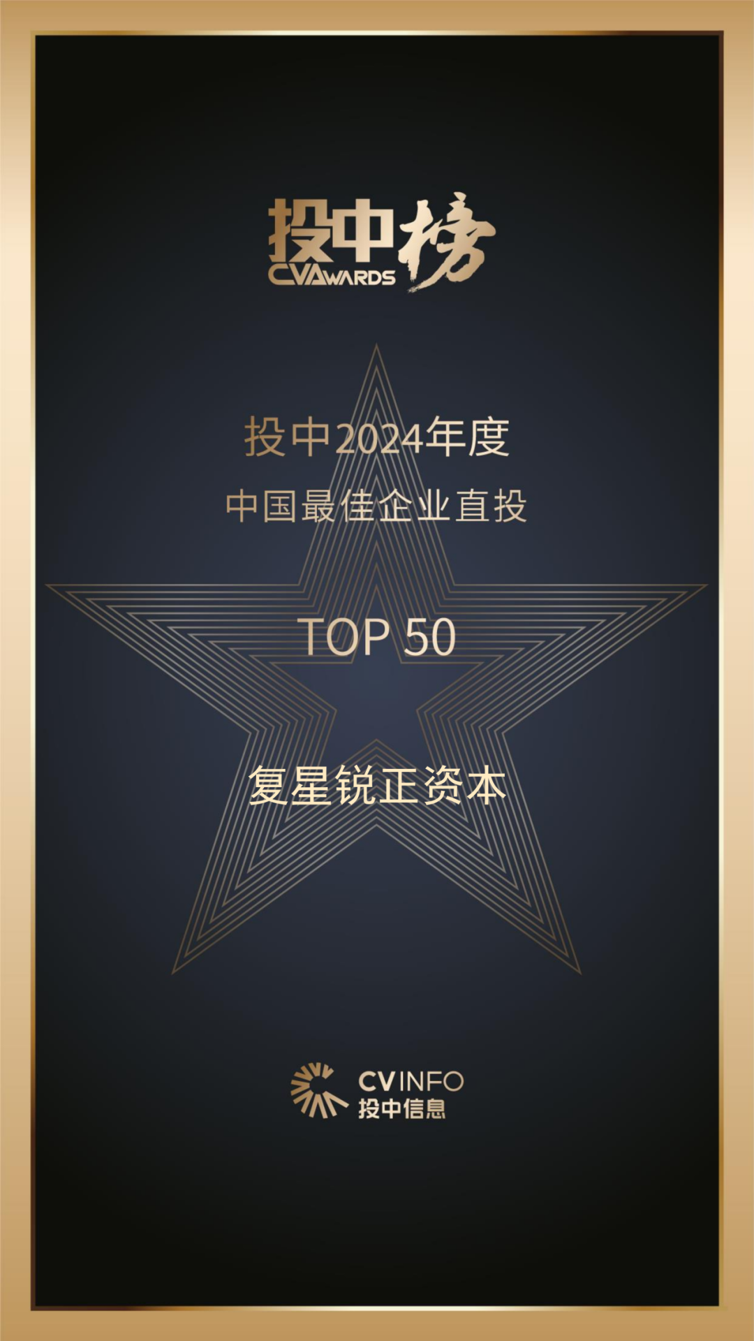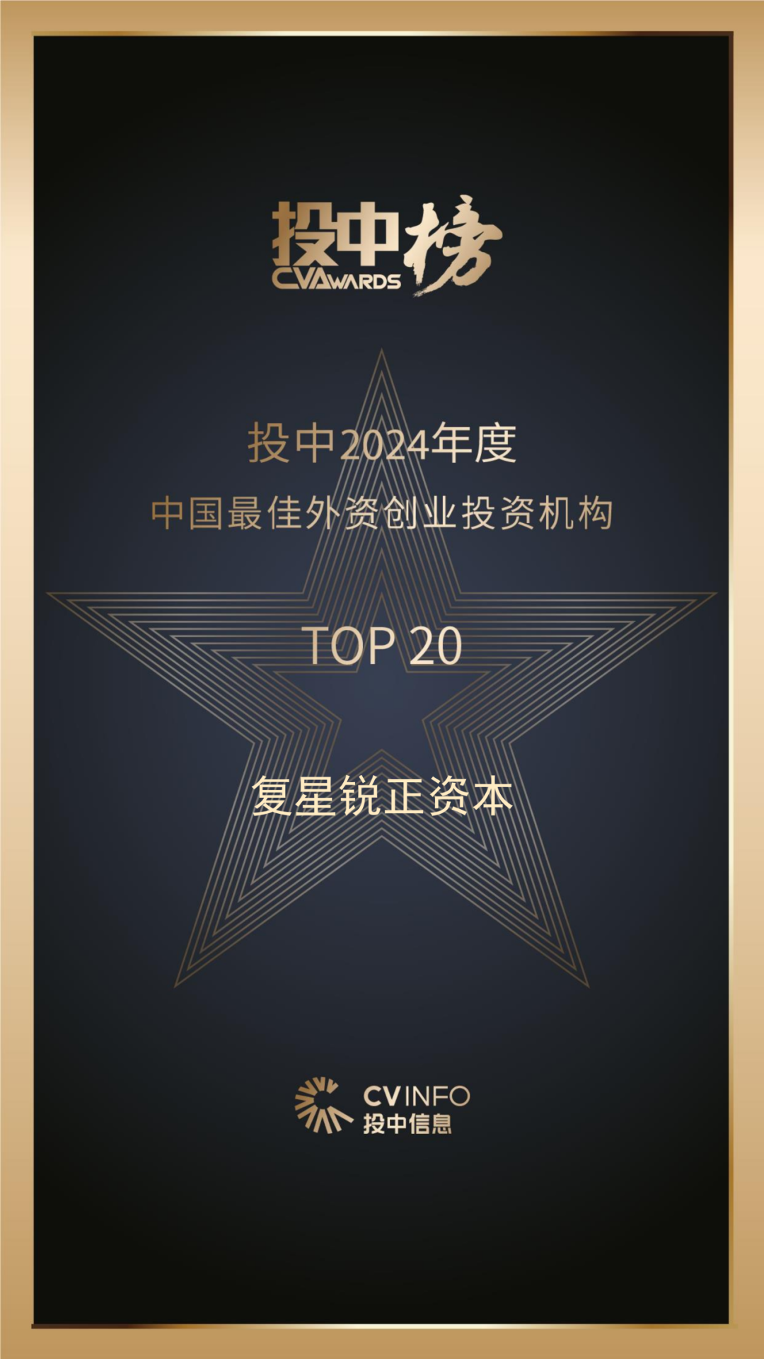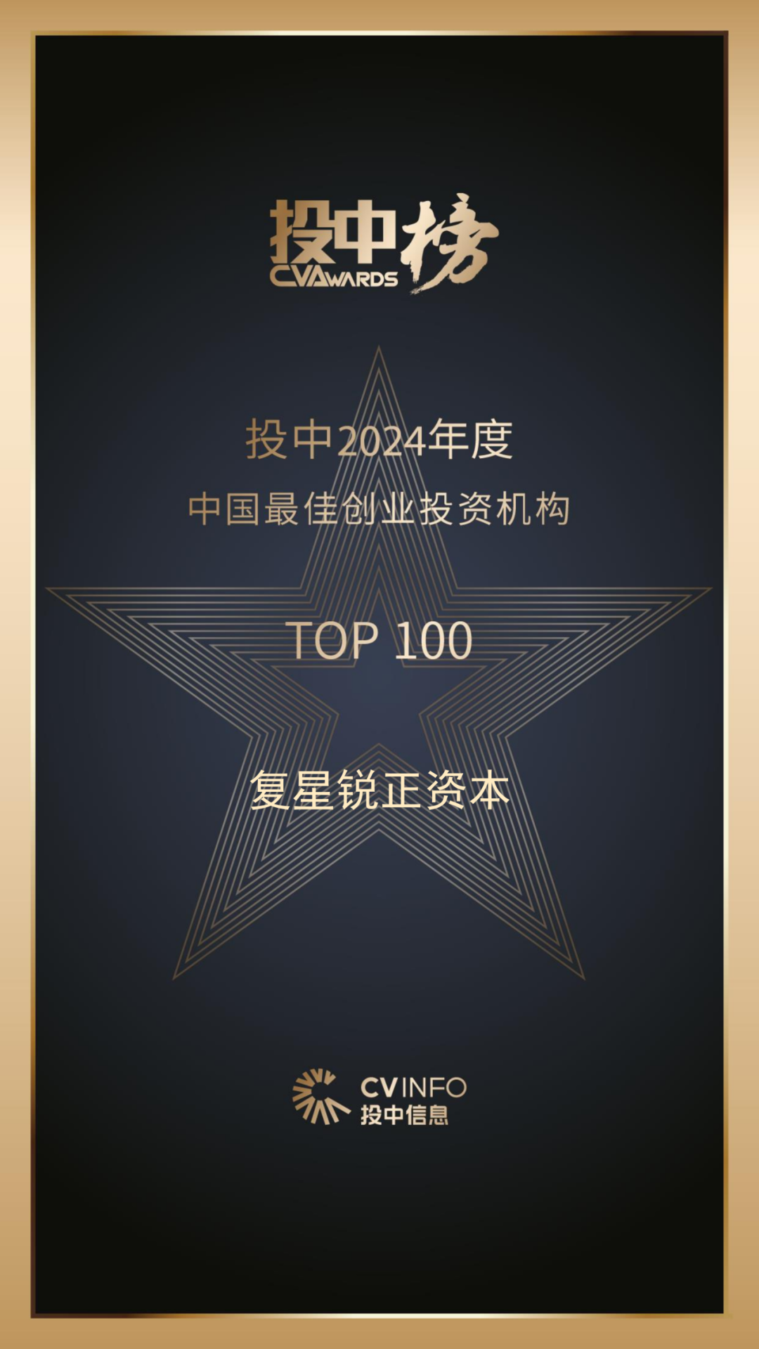 4月16-18日,投中网第19届中国投资年会·年度峰会在北京顺利召开。会上投中榜2024年度榜单重磅发布。复星锐正资本荣登2024年度“中国最佳创业投资机构TOP100”、"中国最佳企业直投TOP50"、"中国最佳外资创业投资机构TOP20"榜单。